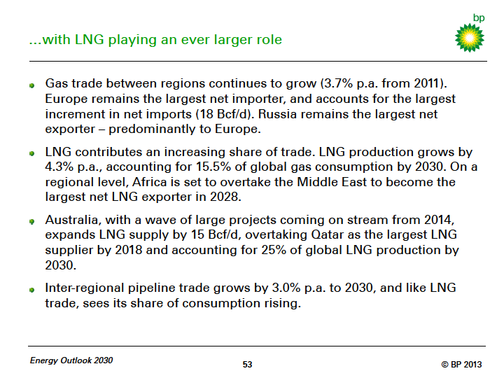 251 BP 2013 205with LNG playing an ever larger role Gas trade between regions continues to grow ( 3.7% p.a. from 2011). Europe remains the largest net importer, and accounts for the largest increment in net imports ( 18 Bcf/d). Russia remains the largest net exporter 226 predominantly to Europe. LNG contributes an increasing share of trade. LNG production grows by 4.3% p.a., accounting for 15.5% of global gas consumption by 2030 . On a regional level, Africa is set to overtake the Middle East to become the largest net LNG exporter in 2028. Australia, with a wave of large projects coming on stream from 2014, expands LNG supply by 15 Bcf/d, overtaking Qatar as the largest LNG supplier by 2018 and accounting for 25% of global LNG production by 2030. Inter -regional pipeline trade grows by 3.0% p.a. to 2030, and like LNG trade, sees its share of consumption rising. Energy Outlook 2030 53